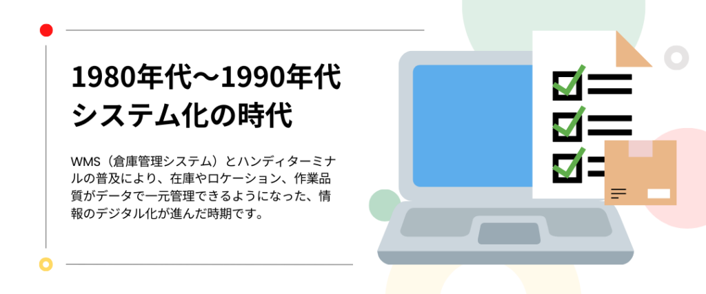 ここで、今や当たり前となった「WMS(倉庫管理システム)」が登場します。 それまで人の頭や紙で管理されていた「どこに何があるか」というロケーション管理や在庫管理が、システム的に行われるようになり、定着し始めたのがこの時代です。WMSと時を同じくして普及したのが「ハンディターミナル」です。 商品に貼られたバーコードをスキャンすることで、「間違いなく入出庫する」という品質管理や、「いつどこを通過したか」というトレーサビリティ管理が可能になりました。 また、商品1個ずつではなく、パレット単位やケース単位でバーコード管理することで、より容易にモノを動かせるようになりました