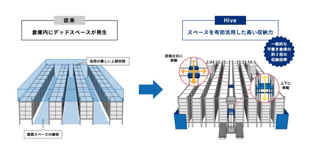 出典:株式会社APT「HIVE|前後・左右・上下に自在に動くシャトル型倉庫システム」